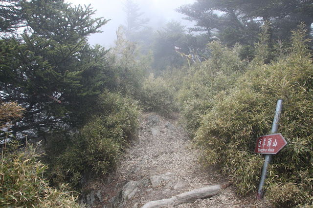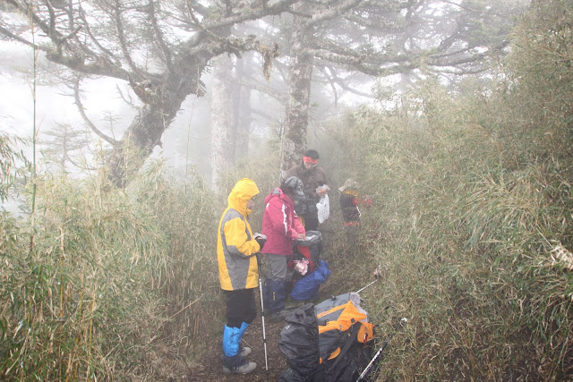 三叉路,放下重裝後再往前不久便抵三角點處,至此依然是濃霧壟罩四週,