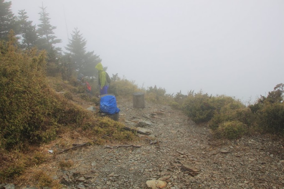向上切。林徑與稜徑續行期間,濃霧伴隨霧雨亦持續著,約莫12點13分左右上抵