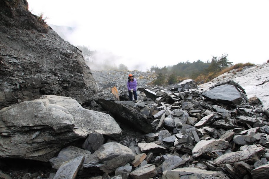 此崩塌路徑最後無法銜接原路徑,最後往回走另一條崩塌路徑上切至稜線