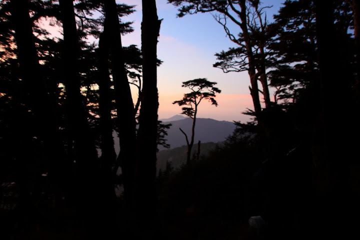 行程第五天天氣終於放晴了,0520,日出光芒從樹林間縫隙透射進來