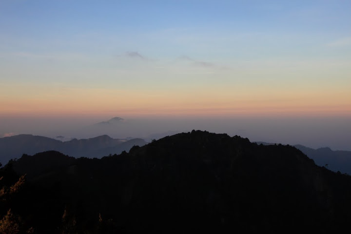 峰間之叉路,等待日出同時,東、西兩方的山巒呈現不同之景,一邊為晨曦映射、一