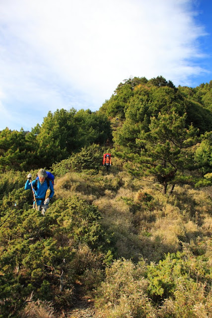 山巒稜線真是極致之美,通過瘦稜斷崖與崖壁拉繩垂下便進入箭竹林,續行約莫半個