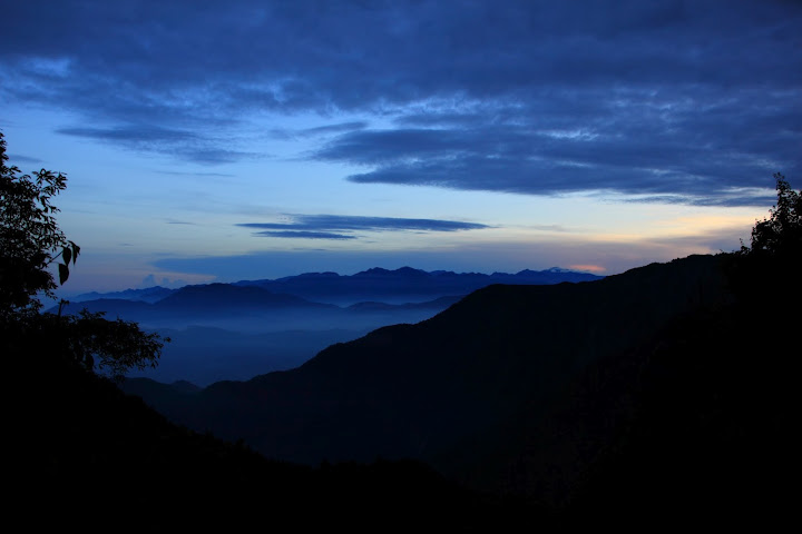遠望晨間山巒一景