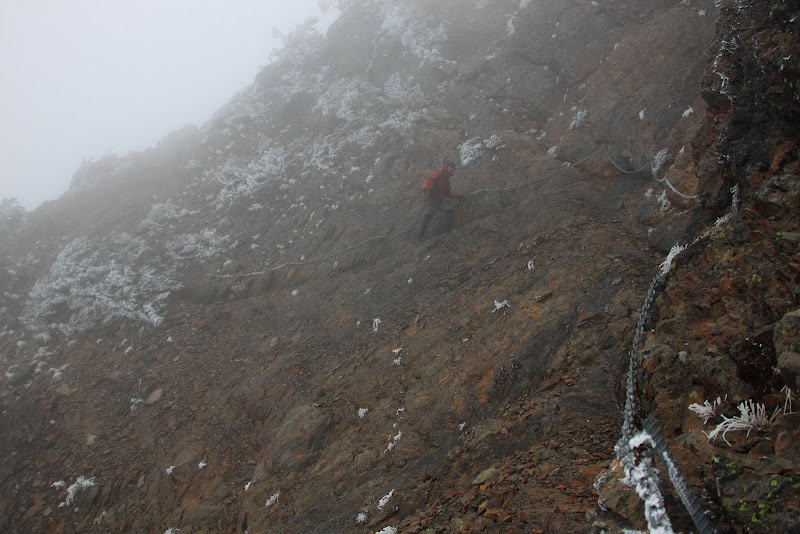 往北峰碎石坡與鐵鍊已然結上層層霧淞