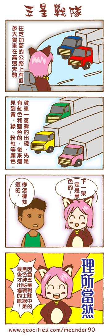 沿路所見的大貨車真是什麼顏色都有,讓我想在兒時在電視上看到的日本特攝劇戰隊出動時的埸面,當年看五星戰隊,黑色的神秘戰士總會在最危急的時候來解教救主角們。(這些戰隊系列到最後通常會發現原來神秘戰士是主角失散多年的就親人,超老土的劇情)