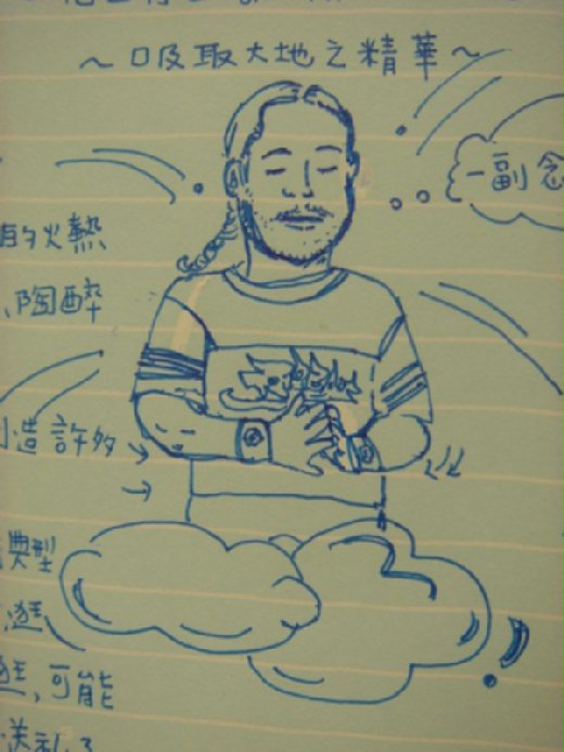 到陽明山的冷水坑就煞有其事地筆劃起來, 嘴巴還念念有詞, 好像快要昇天的樣子, 有一天到孔子廟, 他手癢居然打起大門旁的大鼓, 那通常是加冠典禮才會啟用的鼓,廟方人員馬上趕到制止, 一看到老外有點傻眼, 於是態度稍為和緩地勸說~