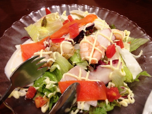 海鮮沙拉(好像是1100日元):有鮭魚、有蝦、有鮑魚、有章魚、有貝類,記得的味道中全無海產的腥。醬料配得好,量是不多不少的剛好,味道是提味卻不搶去生菜及海鮮原本的味道。至於章魚,