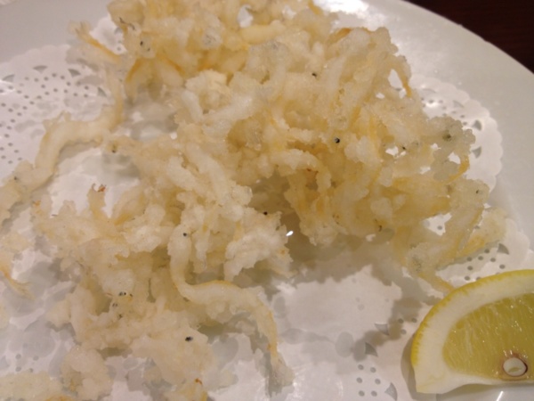 炸白魚(大概是870日元吧):菜單上寫的是「白魚の唐揚」,不知什麼是『白魚』,看起來很像是炸銀魚。但這家炸物有個特點:「無油ㄏㄠ味」。小魚的那股肉質感,在那層脆而不酥(個人覺得,炸的東西,若是外層太酥,入口必油)的外衣下,仍吃得出來。很好的下酒零食,是個人的「若再來,必點!」。