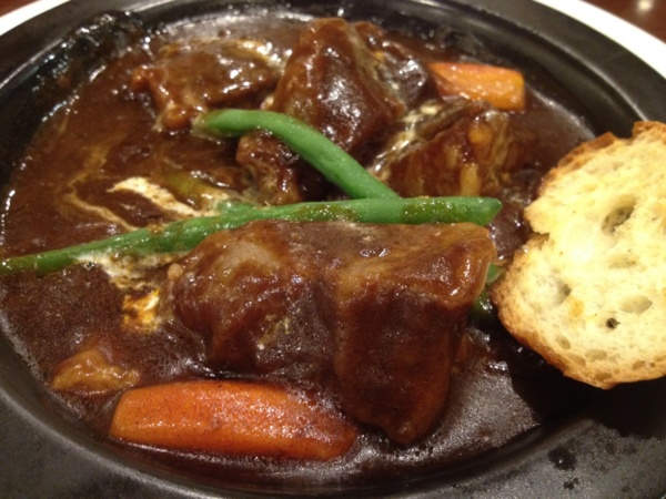 燉牛肉(哈,喝太多,好像是1430日元):若沒喝多記錯,店家應會問,是否配白飯。應是日式的紅酒燉牛肉吧。味道濃郁卻不厚重,帶有一種牛油香味,雖有牛脂的滑潤,但無脂肪的噁膩。也許日劇看太多了,嚐到這種口味,「日式洋式」、「戰後」等等字眼,頻頻閃入腦海。