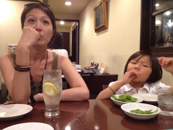 其後,那人又詢問我們一家自何而來?當得知我們來自台灣後,又深表對於台灣人幫助日本於振災一事上的感謝,當下,幾位客人間一陣日人那種有禮的騷動,感覺上似在交談著台灣對日本於振災一事上的諸多種種,其中一位中年婦女(下圖白帽女仕),還頻頻不想被我們發現而於教授一旁側語請其詢問及轉述:「兒子幾歳?」,「兒子很可愛」一類的事。