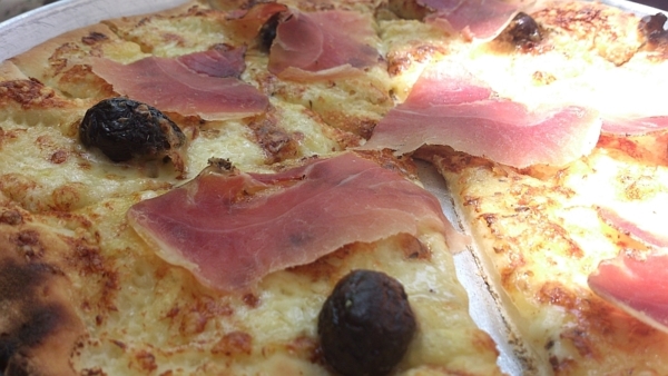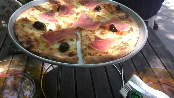 火腿Pizza,上頭的油漬橄欖帶核,餅皮雖偏薄但有種介於脆韌之間的嚼勁。放的起司的量剛好,料也單純,相較於起司牽絲的美式Pizza吃完後常覺一肚脹膩,這家的Pizza即便是我一人吃完了2/3,仍能喝下兩三瓶啤酒,很對我胃口,所以其實這是第二次來吃了。
