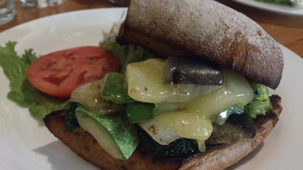 烤蔬菜三明治。烤的恰好脫生的菜帶著股炙烤的火氣,一口咬下去既不出油也不出汁水,難得啊。