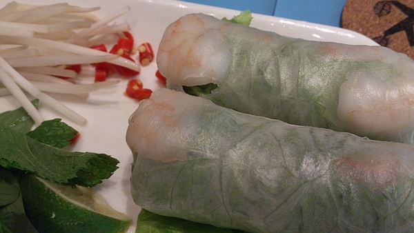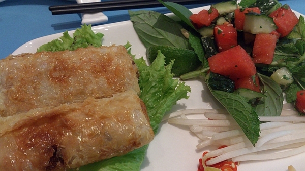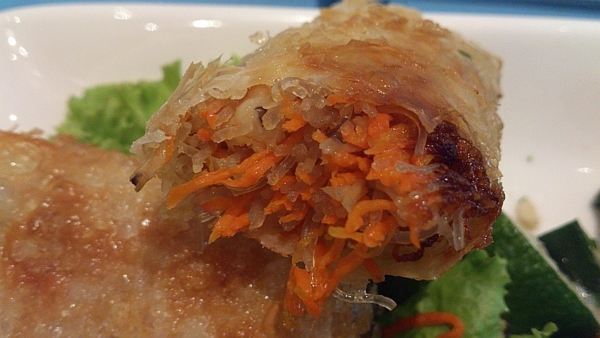 越式炸春卷裡包了粉絲,外衣不若中式春卷般硬及脆,而是有點近似炸腐皮,但又不若炸腐皮油膩,也比它油亮的外觀來得輕爽。