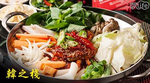 只要999元(四人價)即可享有【韓之棧】原價1,585元韓國正統風味四人餐:韓國春川炒辣雞/部隊鍋(2選1)+包肉生菜四份+人蔘雞腿鍋/泡菜鍋/豆腐鍋/海鮮煎餅/辣炒年糕/炸醬麵/石鍋拌飯/山東燒雞(8選4)+甜點四份+白飯、熱湯及多樣道地小菜無限量供應。