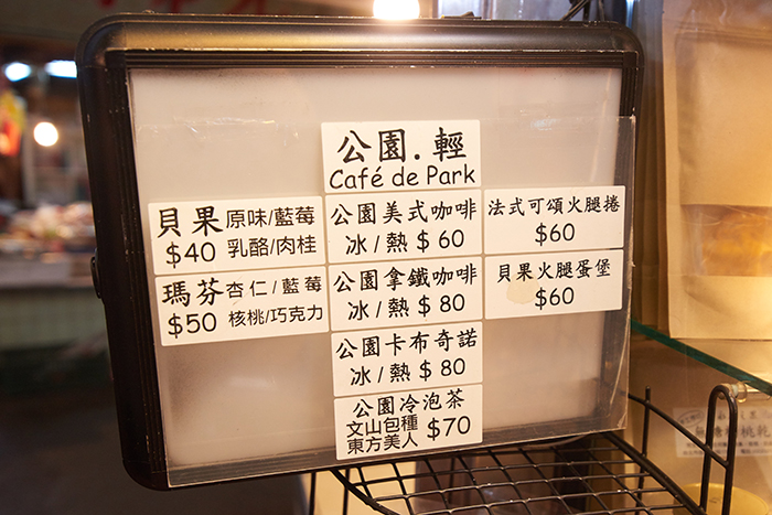 特別推薦:貝果火腿蛋堡、藍莓貝果、瑪芬(巧克力)、瑪芬(藍莓)、黃金酥皮蛋糕、蔓越莓果乾、帶籽葡萄乾、台灣芭樂果乾、公園拿鐵咖啡、公園冷泡茶