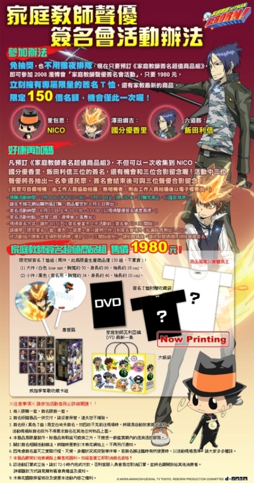 免抽獎,也不用徹夜排隊,現在只要預訂《家庭教師簽名超值商品組》,即可參加2008漫博會「家庭教師聲優簽名會活動」,只要1980元,有專屬限量的簽名T恤,還有家教最新的商品,限定150個名額,機會僅此一次喔!