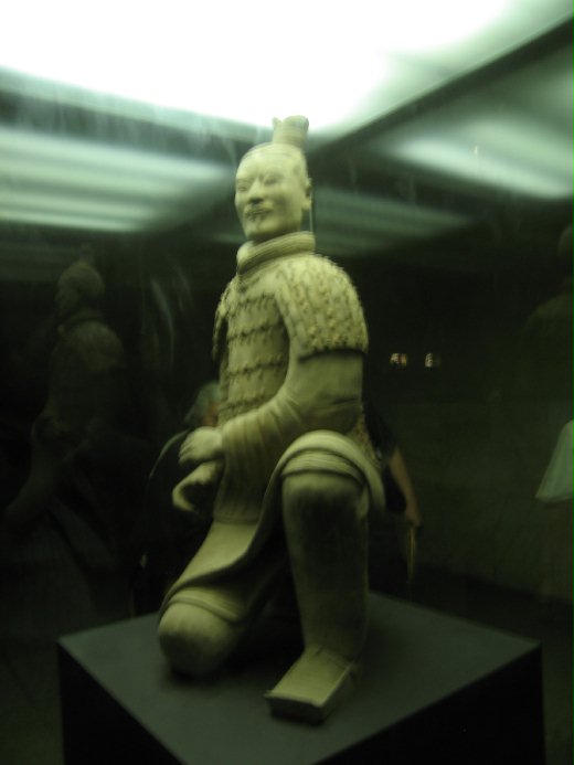 幾年前兵馬俑曾經來台展覽,造成極大的轟動,聽說有幾十萬人前往參觀。今年兵馬俑又來了,在歷史博物館展開長達數個月的展出,自然又湧入一批又一批的人潮。最受矚目的莫過於綠面跪射俑,據說他是六件出土的彩色兵馬俑中唯一綠面的,也聽說展期結束後,綠面跪射俑就不再對外展出,就算到西安也無法親眼見到它。