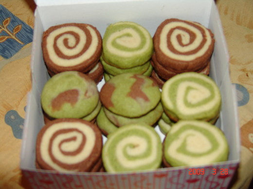 10. 將冰過的麵糰取出,一份香草麵糰疊上一層巧克力麵糰後捲起來