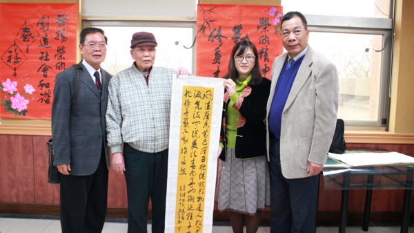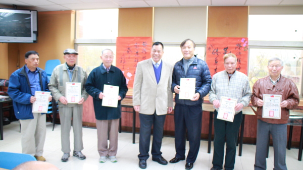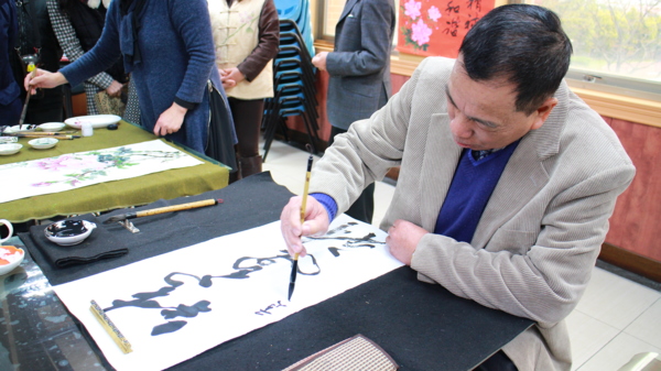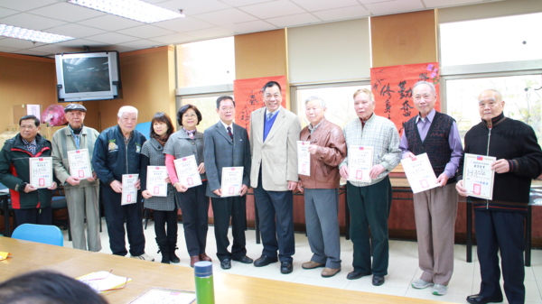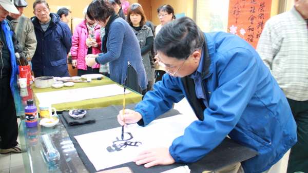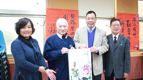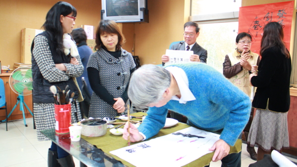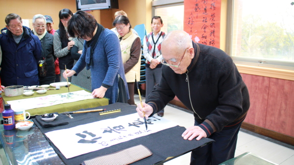 〔記者徐偉珍、陳俊穎、古美珠桃園報導〕昨日平鎮社區大學樂齡班開學第一天適逢白色情人節,此次的課程與「榮欣書畫協會」的老師們一同合作,現場人才濟濟,師資們大顯身手,也有高齡九十六歲的粉絲前來。理事長黃慶章老師表示,「這位高齡九十六歲的「粉絲」是我們的粉絲,我們也是他的粉絲。」可見黃理事長不但書法功力深厚,人也幽默風趣。