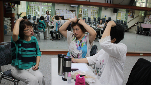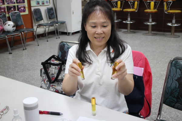 二樓正在進行芳香生活保健班課程,李雅文老師為學生示範著如何調製精油的方法,她說芳香精油的調製會依據個人能量調配出不同濃度與香氣,屬於自己獨特的配方精油。李老師並且依據人體的經脈點示範用精油來調理舒緩頸肩痠痛,以及說明痠痛形成的原因,有效排除及保健的方法,課程有趣而且實用。
