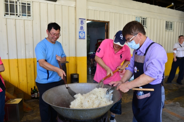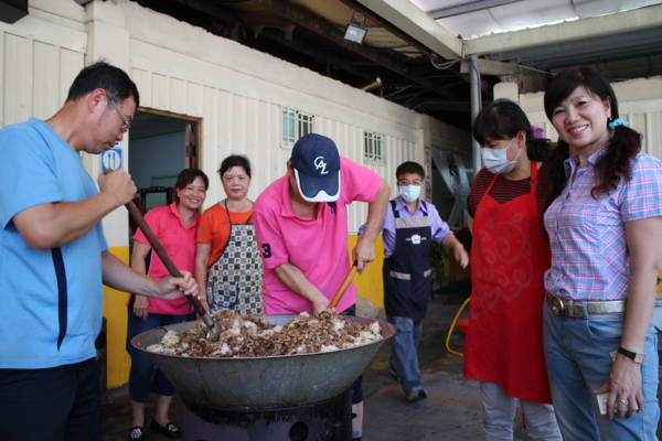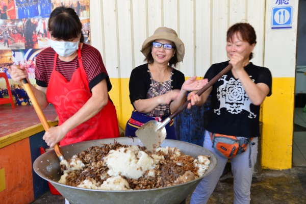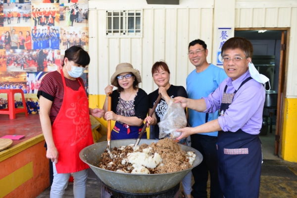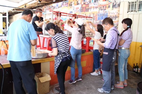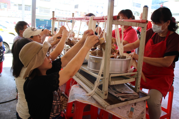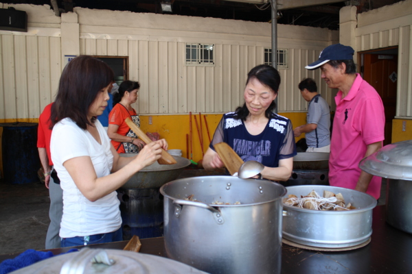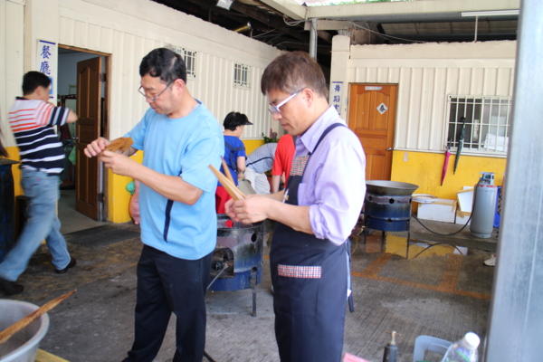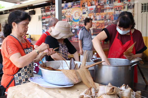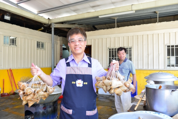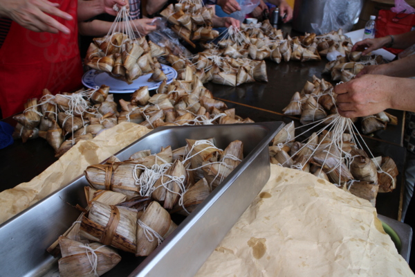 早上將蒸好的糯米飯與昨天準備好的配料混合調勻在一起,大夥齊心動手包起粽子來。看不出來,我們的男生會員也是龍紳學會的會長袁安明先生也會包粽子,一問之下才知道,小時候他在眷村長大,每年端午節看著媽媽包粽子給他們吃,所以耳濡目染不用教也就會了。經過大家的努力,12:00大家終於可以吃到香又Q,料又多,媲美五星級的粽子了。