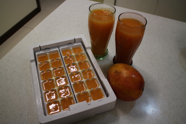 我和女兒高興之餘總喜歡來支義美牌紅豆(花生、芒果牛奶)冰棒,家裡冰箱隨時都會有它們,這兩天吃完沒有補貨,姊姊鼓勵媽媽自己做,喝果汁又可做純果汁冰棒。