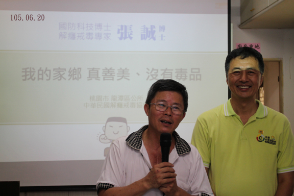 此次反毒宣講活動「我的家鄉 真善美、沒有毒品」,在龍潭區公所社會課呂課長的安排之下,為社區里民作宣導活動。張誠博士提出解癮戒毒新觀念,跳脫傳統威嚇處罰及隔絕使用的管制手段,經由正念減壓、匿名談話方式,激活腦部。只要個案願意給自己機會,連續28天的正念(感恩、行善)及減壓(腹式呼吸),就會有很大的成效;經過四個月8次的解癮活動。