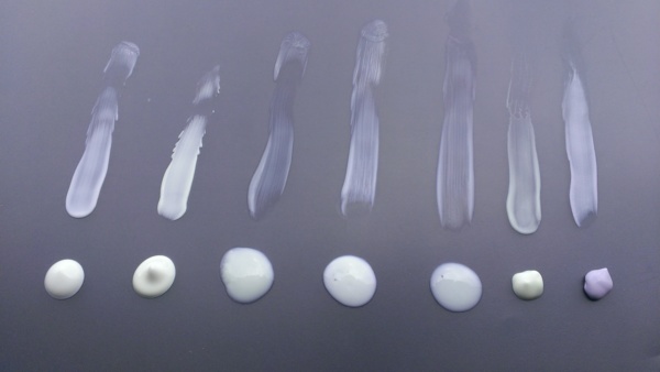 擠出來和推開的顏色比對,可以明顯的看出每一個防曬的質地與顏色差別。