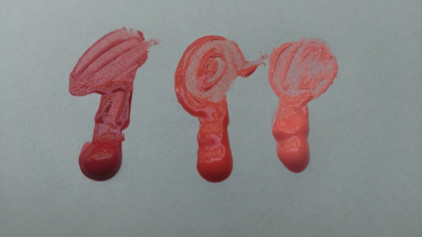 三隻擠出來的顏色,感覺就像顏料一樣阿!這三隻我最喜歡魅紅,用來化咬唇妝超適合,要深要淺都可以自己控制顏色,想要大紅唇就用多一點,如果只是要潤色的話就用一點點混合艾杜紗的護唇精華,就變成潤色的護唇了唷!!