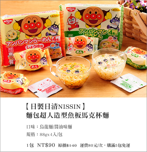 只要90元(5包免運)即可享有【日製日清NISSIN】原價140元麵包超人造型魚板馬克杯麵1包(88gx4入/包),口味:烏龍麵/醬油味麵。