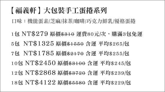 平均每包最低只要229元起(3包免運)即可享有【福義軒】大包裝手工蛋捲系列1包/5包/7包/10包/12包/18包,口味:機能蛋素/芝麻/抹茶/咖啡/巧克力鮮乳/優格蛋捲。