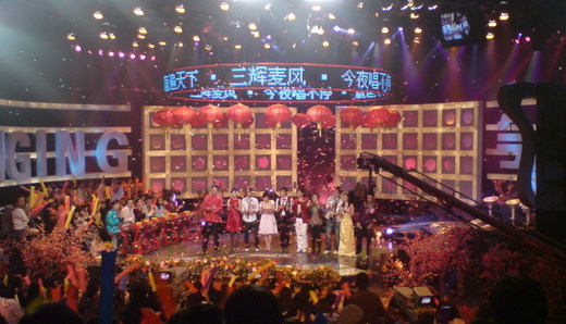 節目裏很多“笑話”。本來沒去想為什麽要那麽早錄制新年節目,要我們穿喜慶些的衣服,現場的布景又假梅花又盆桔,連主持也穿新年一身紅透的服飾,結果主持人在說臺詞的時候說“你看啊,現在是大年初三...”附近的人全在笑,想不到這節目居然提前24天錄影,這倒是解釋了為什麽上次去深圳電視臺參加梁靜茹歌友會那期節目要差幾天就一個月才播出。現場的選手在逐個上場說新年祝福的時候都很不順口,我聽著也很不順耳。