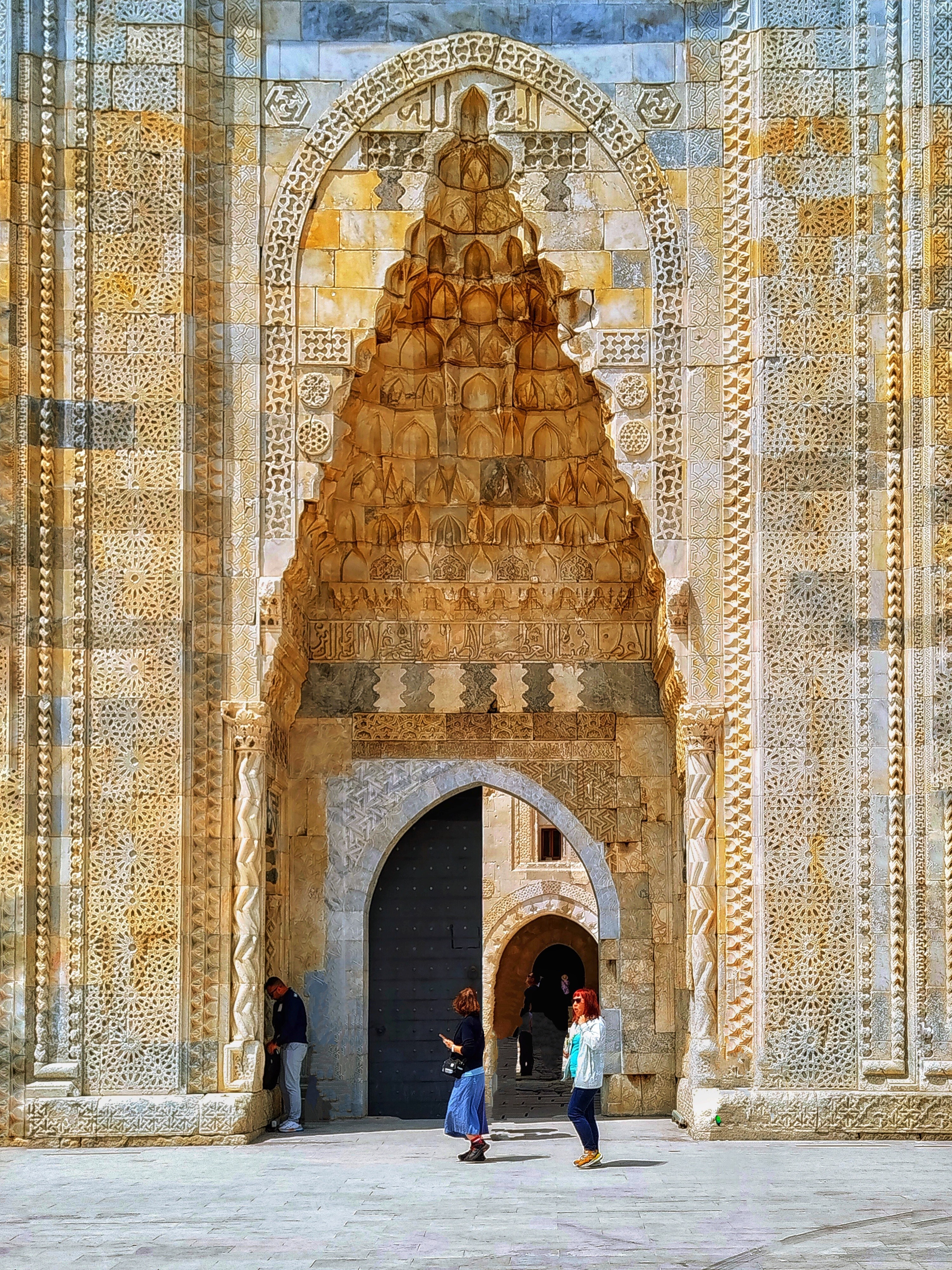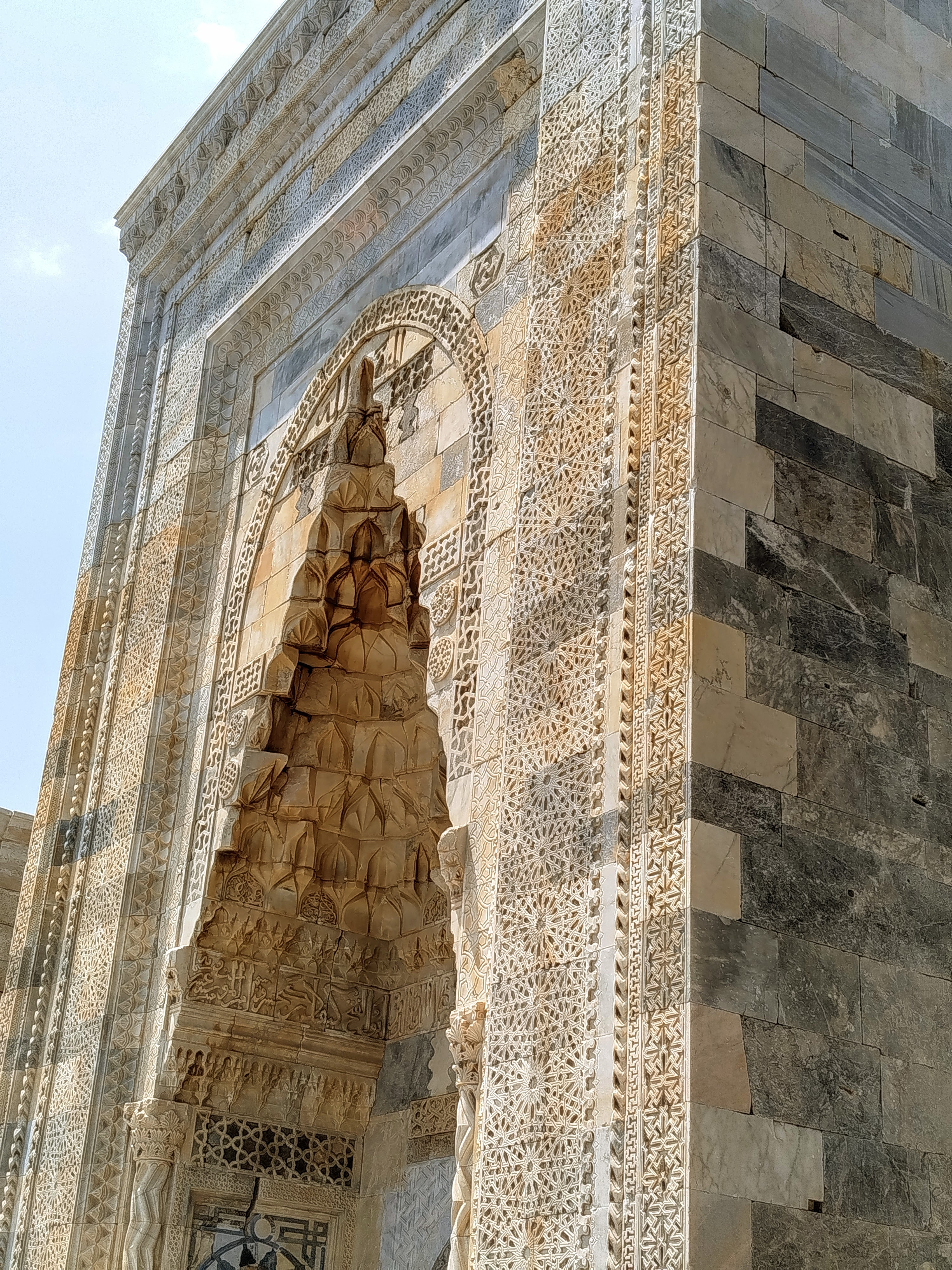 第一張照片驛站正面牆,每一個鏤刻之精細、圖案之繁異、幾何印花拼接之對比…在在都讓我愛不釋手、讚嘆不已;若說巧奪天工之,不為過。單單這一面建築牆夠我花一整天細細觀賞與研究。