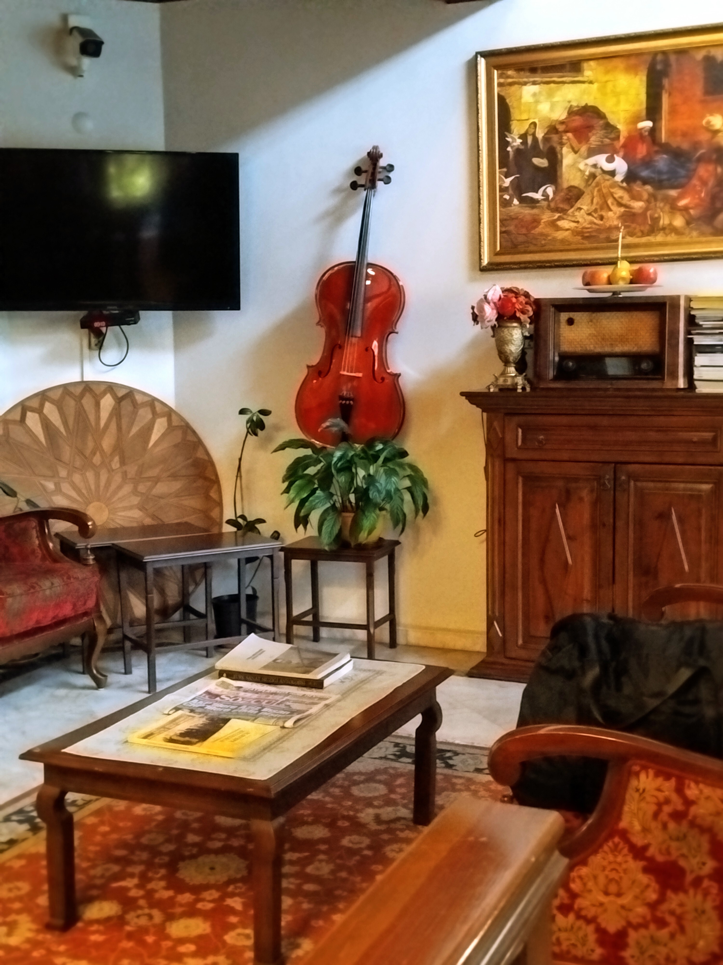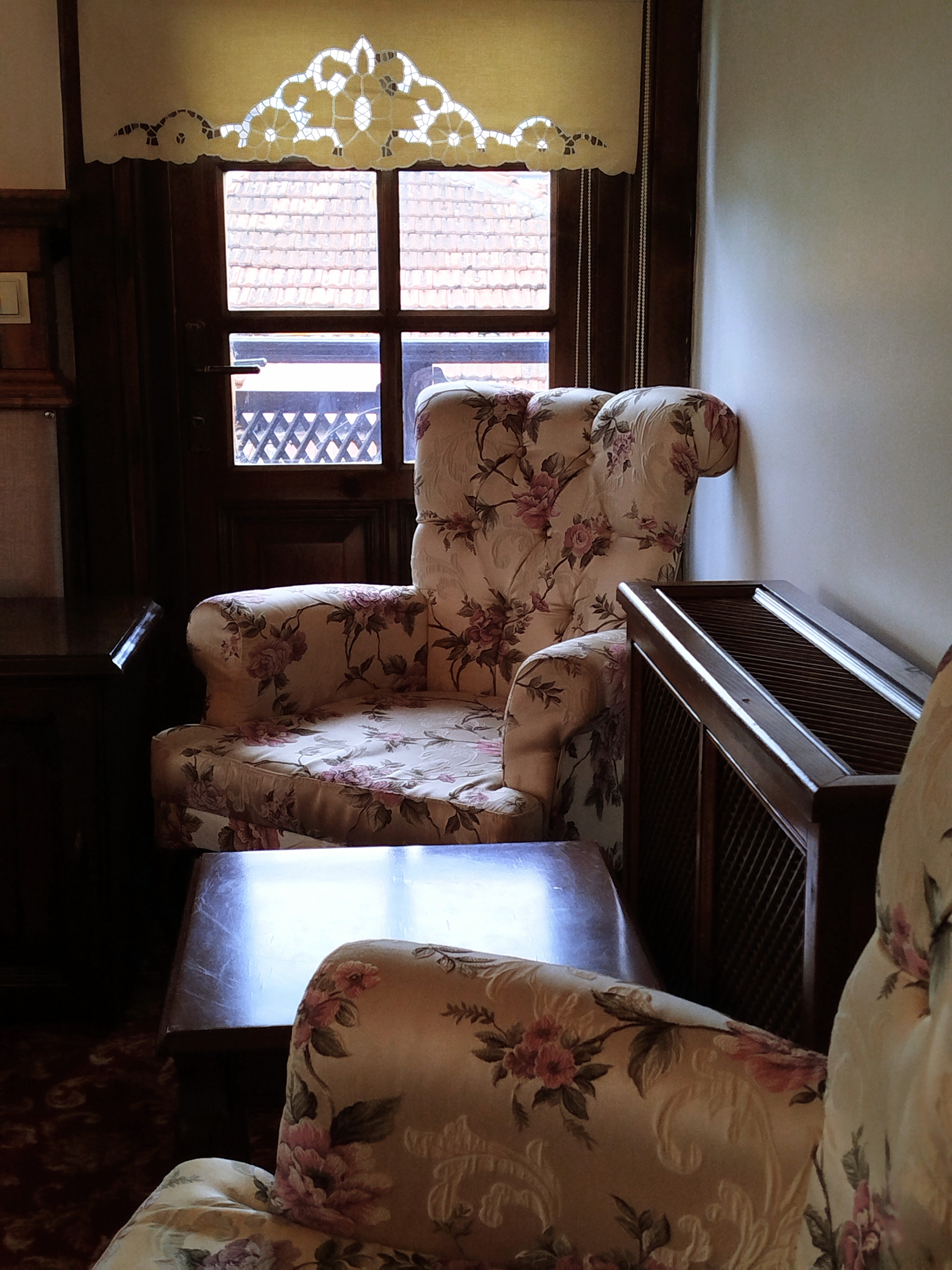 旅館陳設,很典型歐風。角落邊,那兩座緞面花飾