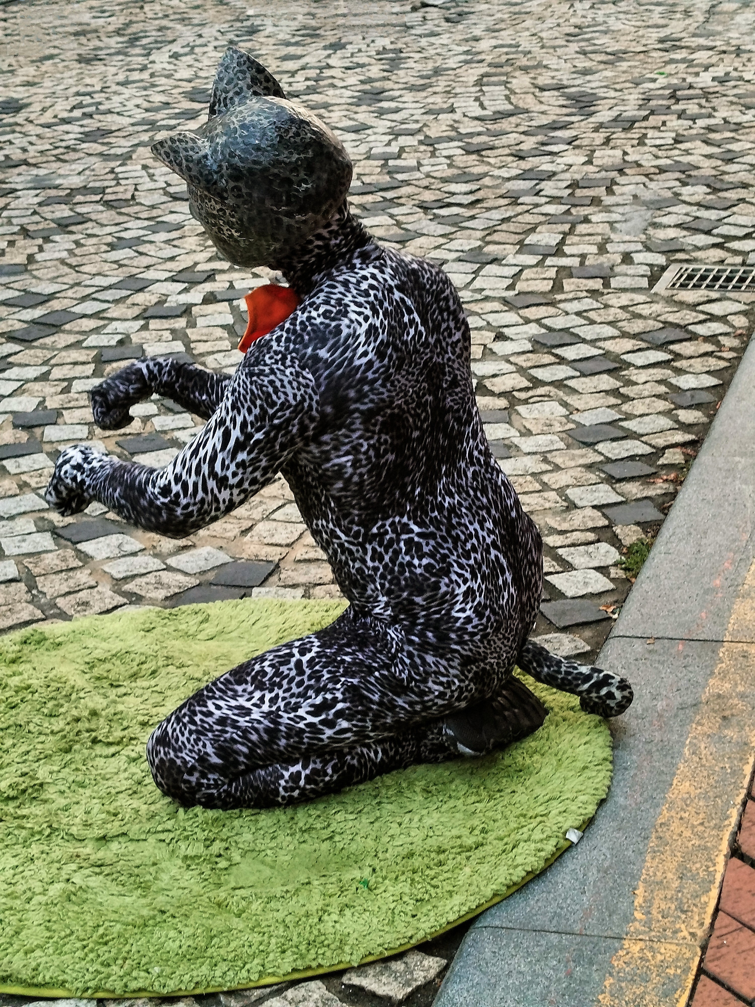 街頭藝人就在這家商店的門口前面表演,近十對年輕父母帶著孩子圍觀,我瞄了一下地上的布袋~裡面沒幾個銅板。