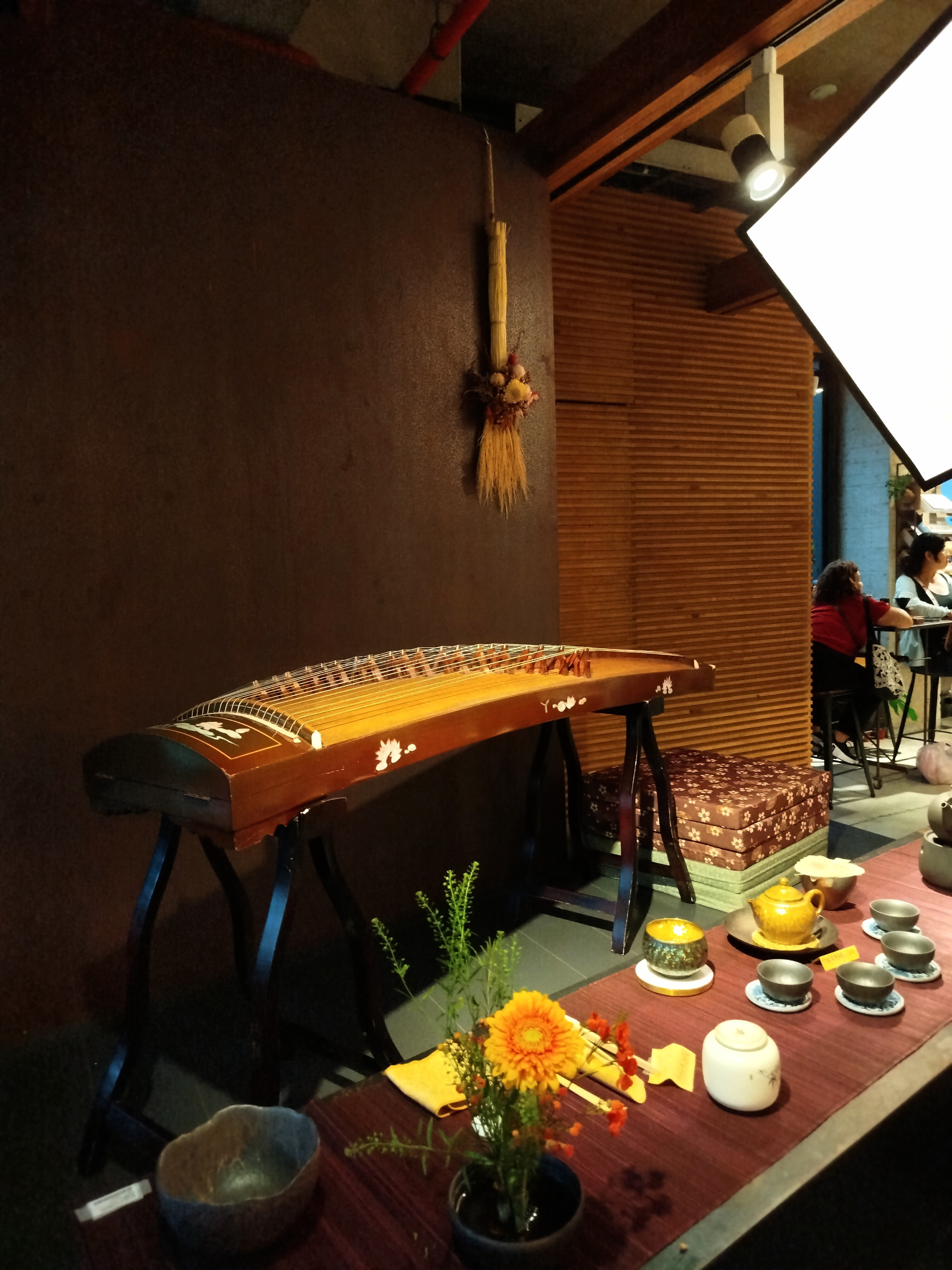 更吸引的是,陽光斜照下的古箏與茶具,一派優雅自然。