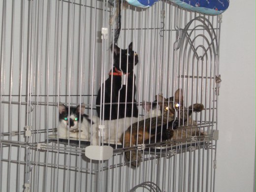 有時家裡要來個仔細的清掃時,幾隻貓會礙手礙腳。這時候我都會把牠們關進三層的大貓籠裡。常常就會看到明明是很寬敞的大籠,幾隻貓就是偏偏要擠在同一層,留下花花老大一個人在一層,好像在說 :