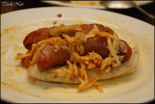 糯米腸包香腸上灑上的菜脯、薑絲等,口感香脆,吃起來會有喀喀喀的聲音,只是味道有點重,菜脯很鹹、薑絲很辣,比例上有點調配不均勻。