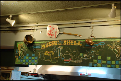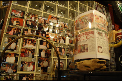 離開玻璃庭院區域到裡面一點的區域,除了有個不小的飲料吧檯以外,整個室內區域牆面上掛滿了來店名人簽名與留言過的紀念餐盤、合影、美食雜誌之報導簡報等物品;看了這區的擺設,大帥小傻才知道原來這兒如此有名呢!