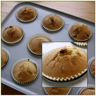 6. 15分鐘拿出烤箱。拿出來之後最好不要馬上吃,否則鬆餅的邊邊會黏在小紙杯上,這樣比較不好。如果能等個五到十分鐘,鬆餅比較不那麼燙,邊邊也不會黏著紙杯。
