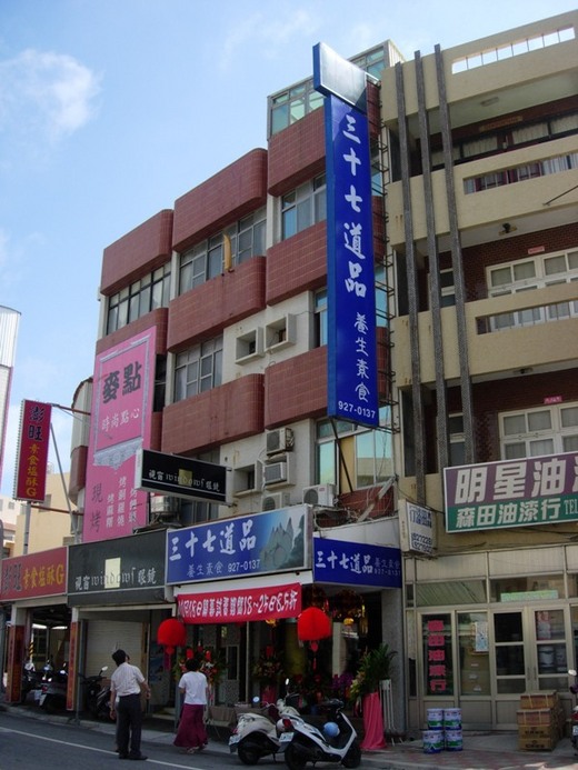 註:【三十七道品】語出維摩詰所說經˙卷上:「三十七道品是菩薩淨土。」佛教謂使修行者達到覺悟的方法,共分七類三十七項。為四念處、四正勤、四如意,五根、五力、七覺支、八正道的合稱。此處泛指《三十七道品養生素食館》在澎湖縣馬公市光復路。【道品珍饈禮淨筵】此句主要說明每道料理都是經過精心烹調的素齋,並隱喻此館服務員態度極佳,很虔誠為顧客奉上最美味佳餚。【道品】1.佛教用語。意謂達到佛教覺悟趨向涅盤的途徑。2.道德品性。此處引申為料理。【淨筵】素齋。語出宋˙蘇軾˙端午遍游諸寺得禪字詩:「焚香引幽步,酌茗開淨筵。」【卅七】即三十七道品。