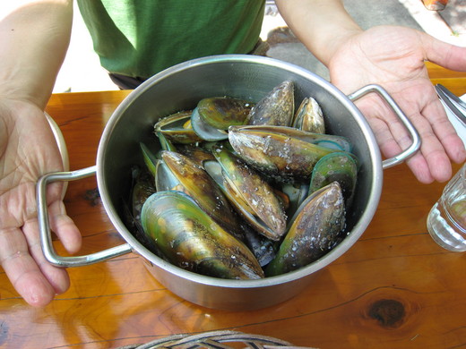 回到大街讀過小廣場的看板介紹,就毫不猶豫的選擇屋頂上有一大桶淡菜的’淡菜鍋’(Mussel Pot, http://www.themusselpot.co.nz/). 果然不愧是綠淡菜的首府,從沒吃過這麼大又甜美的清蒸淡菜(相片在頁末,點選文章才可看到).這種大小,八里熱炒店一盤恐怕只能放7-8個.