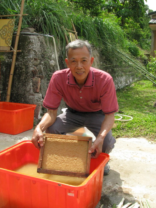 「竹子浸得夠久、洗得乾淨,纖維柔軟才能抄紙」獅潭鄉百壽村73歲的甘阿華比手畫腳說明竹子造紙的秘訣,他說,獅潭鄉桂竹多,早年村民砍竹造紙,20歲時他跟著老師傅學造紙,如今成為全村少數懂得竹製手工紙的長輩,「想不到現在還有機會露一手」。