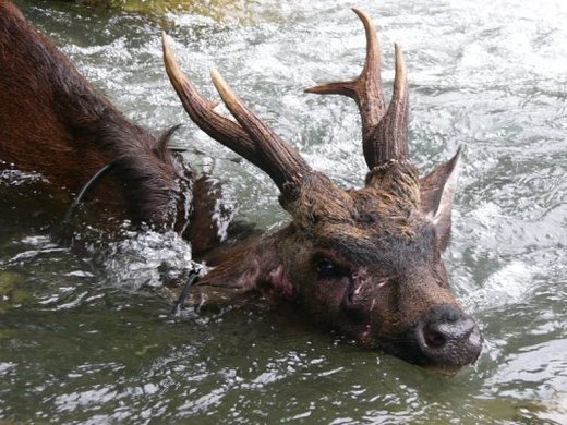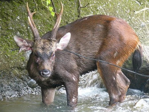一頭二級保育類的水鹿96、09、07被發現遠離海拔一千公尺以上的棲息地,左後腳誤中鋼絲圈套陷阱,遭十多隻獵狗追捕跳下苗栗縣獅潭鄉大東勢溪河床受困,縣府林務課等單位展開搶救大作戰,花了兩個小時救出水鹿,卻因傷勢過重死亡。