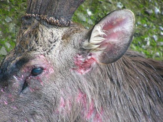 林務課人員確認是水鹿,屬二級保育類動物,這隻水鹿左後腳中鋼絲圈套陷阱,且傷口深及骨頭,研判可能被套了數天沒有進食,獵人昨天上山巡視陷阱,解開陷阱時水鹿趁機逃脫,情急之下跳落溪谷,水鹿受到獵狗群攻擊,頭部血跡斑斑,左耳下方還被咬掉一大片。