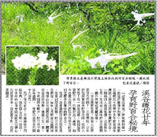 他說,改良過的百合花很常見,但受到環境影響,野百合愈來愈稀有。每年七月野百合盛開時,徜徉山谷有如置身花海,聞著百合淡淡清香,堪稱人生一樂。