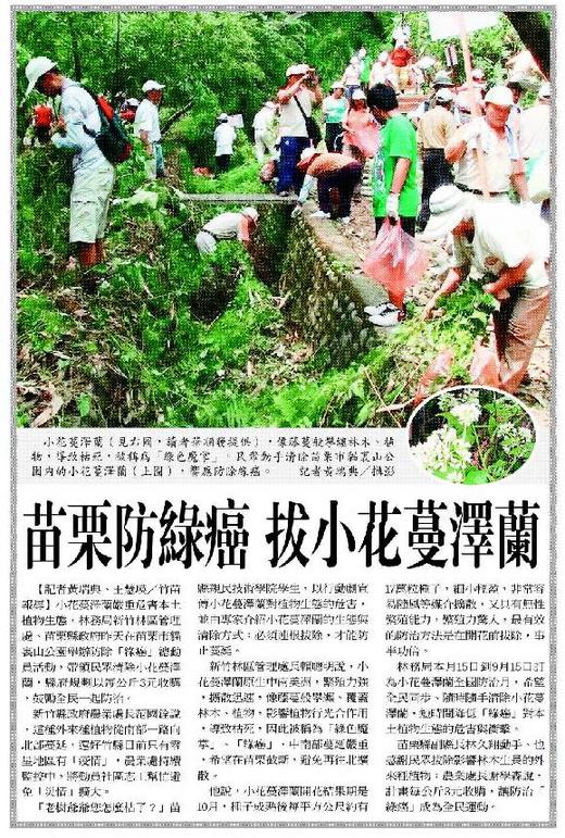 小花蔓澤蘭嚴重危害本土植物生態,林務局新竹林區管理處、苗栗縣政府昨天在苗栗市貓裏山公園舉辦防除「綠癌」總動員活動,帶領民眾清除小花蔓澤蘭,縣府規劃以每公斤3元收購,鼓勵全民一起防治。