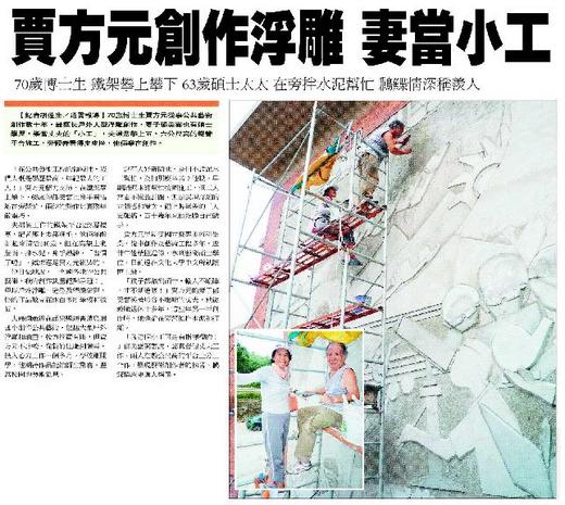 70歲博士生賈方元從事公共藝術創作數十年,最擅長戶外大型浮雕創作,妻子郁美雲也有碩士學歷,樂當丈夫的「小工」,夫婦常攀上五、六公尺高的鐵管平台施工,旁觀者看得皮皮挫,他倆樂在創作。