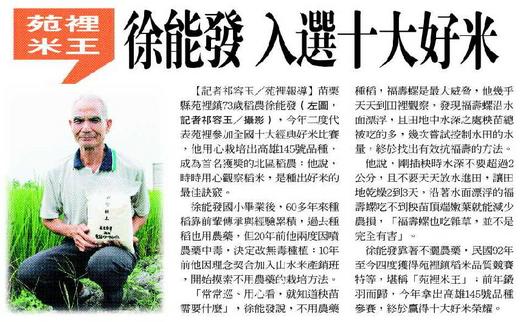 靠著不灑農藥維持地力加上用心照顧,徐能發從民國92年至今四度獲得苑裡鎮稻米品質競賽特等,堪稱「苑裡米王」,前年曾在十大經典好米比賽鎩羽而歸,今年再以用心栽培的高雄145號品種參賽,終於贏得十大好米榮耀。
