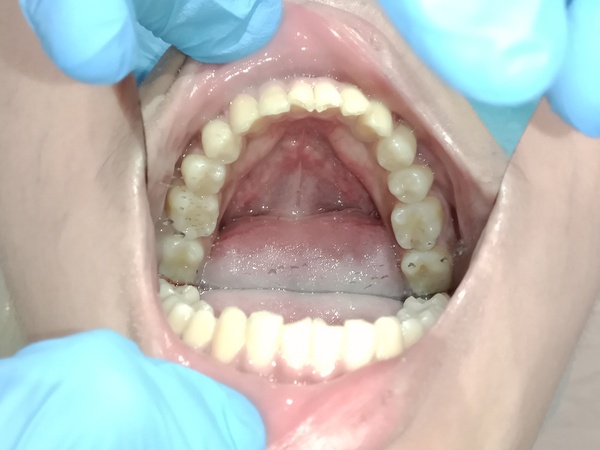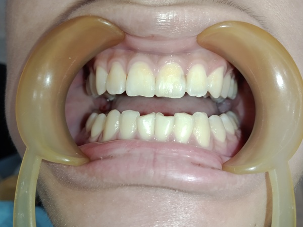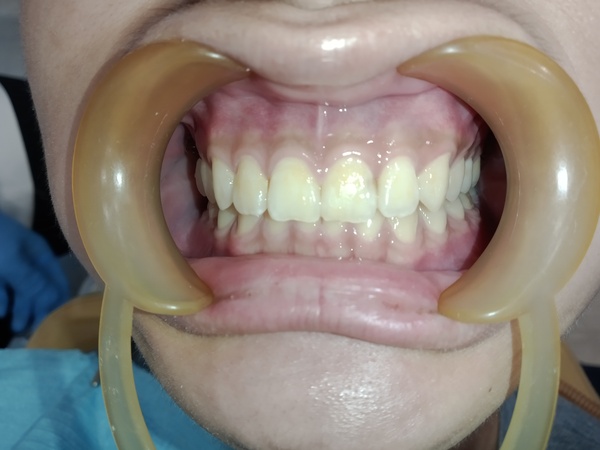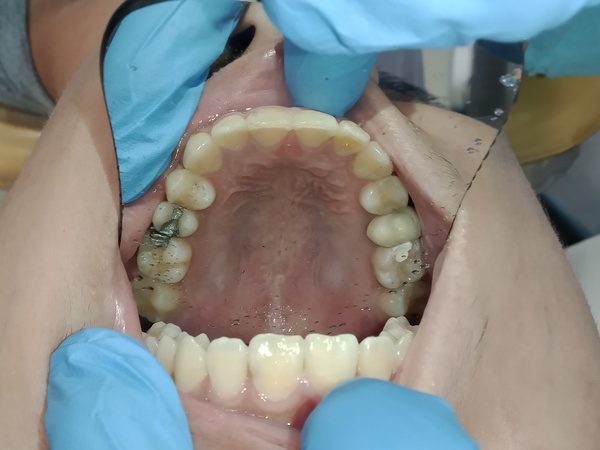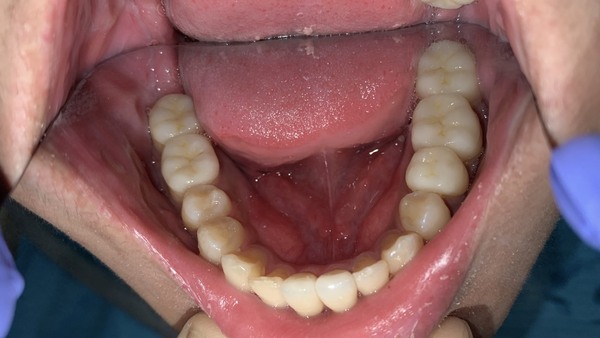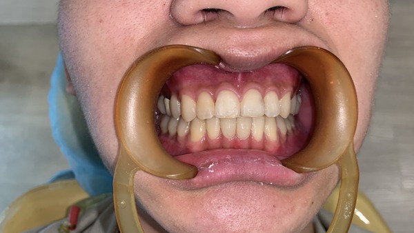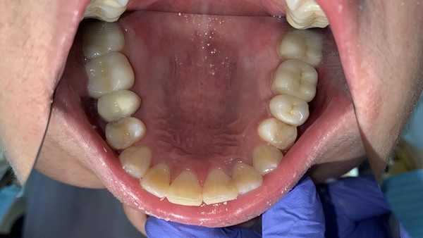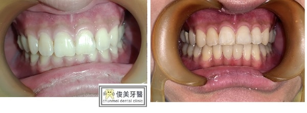患者為男性,年約20歲,於門診時表示要檢牙齒,看不到自已的下排下,且下排有幾顆很擠。想要改善,經醫師評估後:建議患者將智齒分次拔除外,並建議以矯正治療將牙齒咬合做調整,並指出是因後牙牙齒較凹陷且前後牙高低落差較大,導致咬力分配不均,造成前牙嚴重磨耗,需同時做咬力分配來改善。